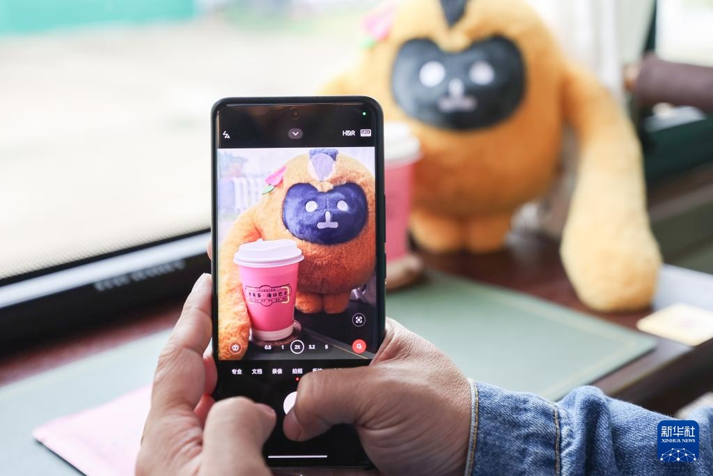 4月6日,游客在老爸茶巴士“消博会专线”上拍摄消博会吉祥物。