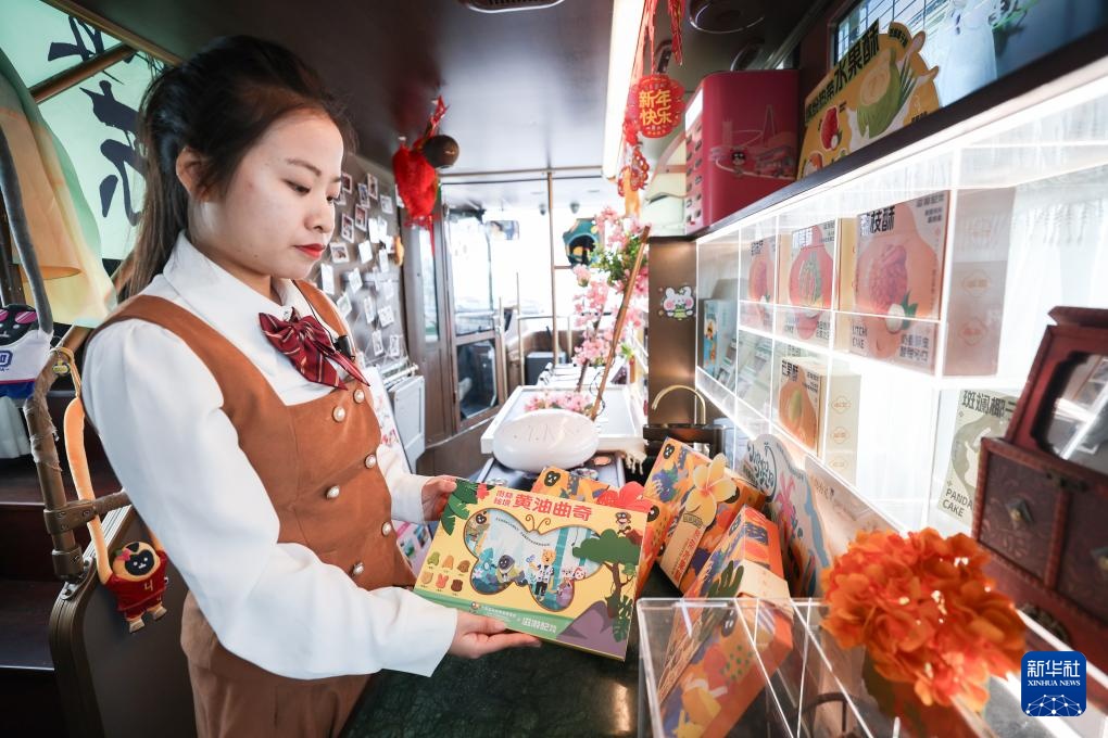 4月6日,乘务员在老爸茶巴士“消博会专线”上展示消博会周边产品。