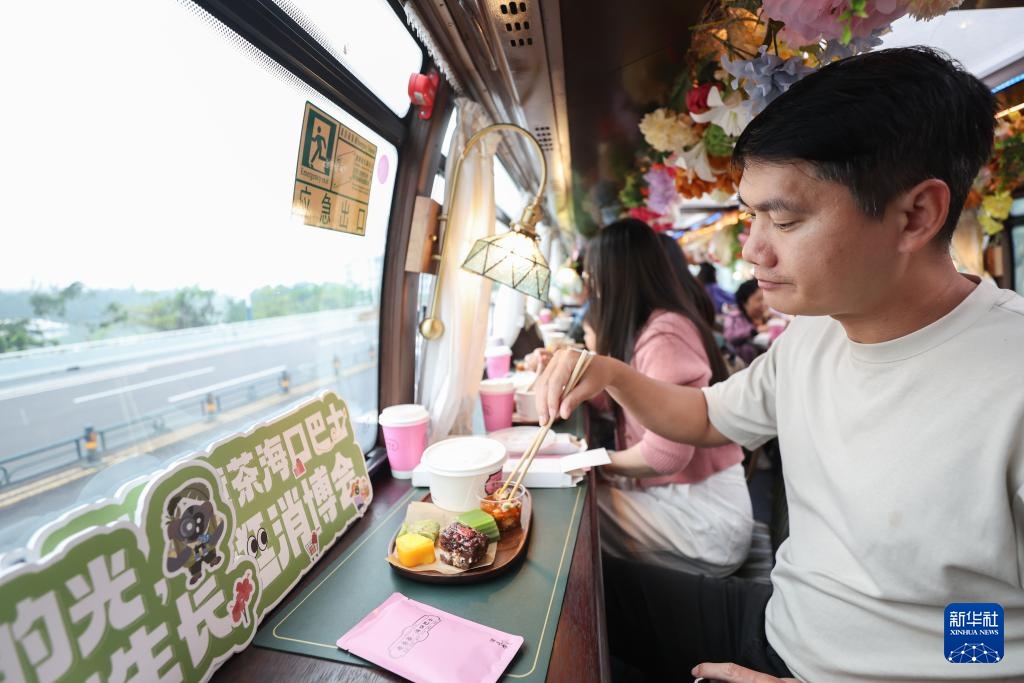 4月6日,游客在老爸茶巴士“消博会专线”上体验特色老爸茶点。