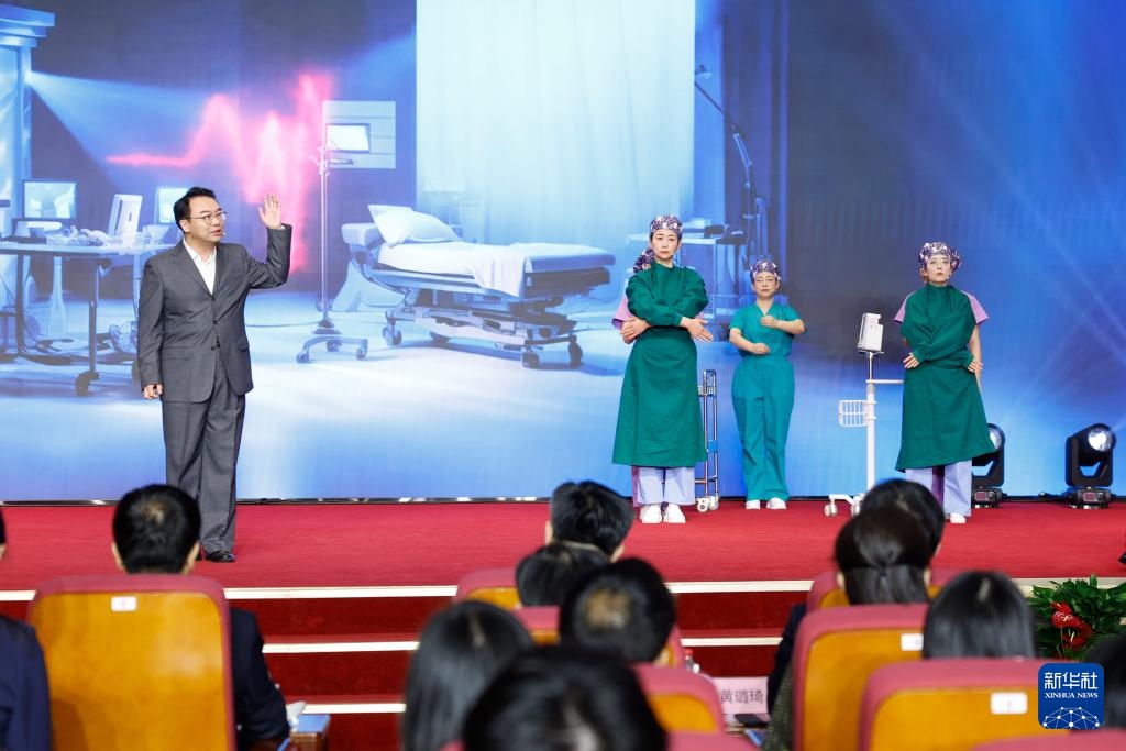 4月7日,来自北京市海淀区妇幼保健院的医护人员在活动现场表演根据真实案例改编的《生命保卫战》。