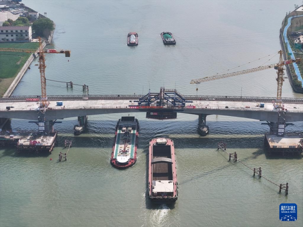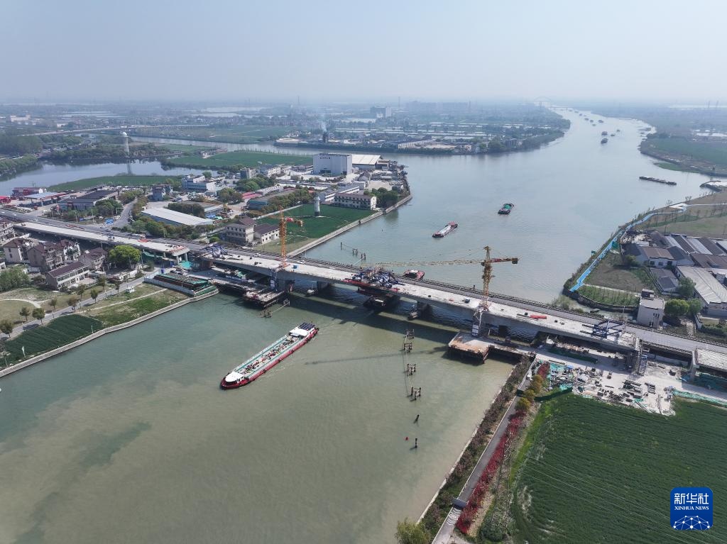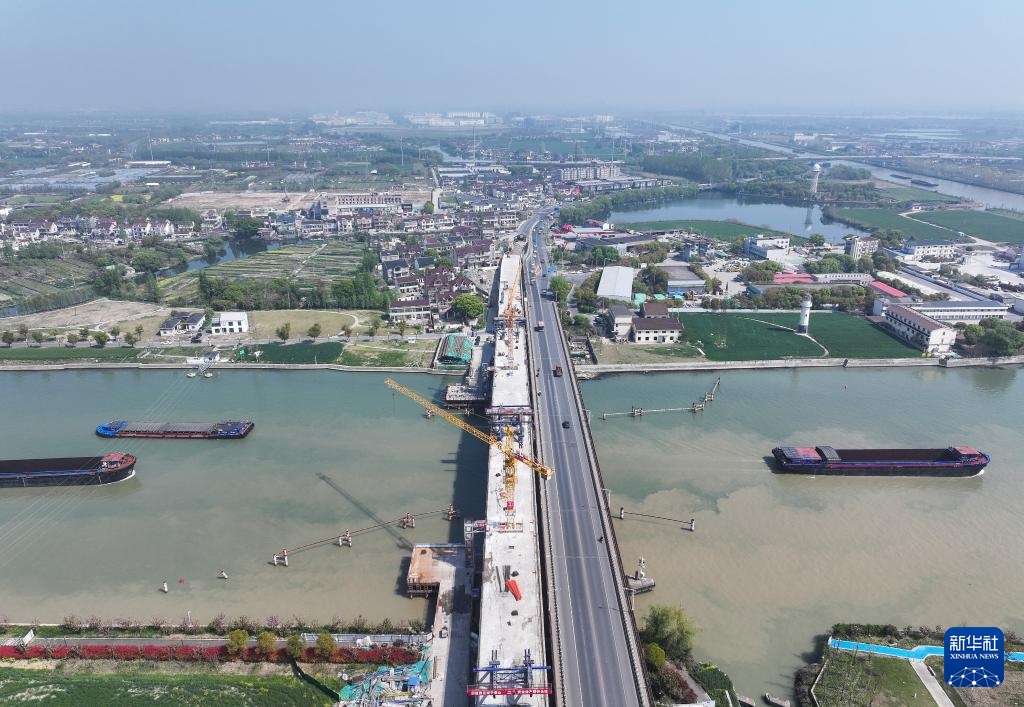 4月8日拍摄的长湖申线(江苏段)航道整治工程新建平望大桥建设现场(无人机照片)。