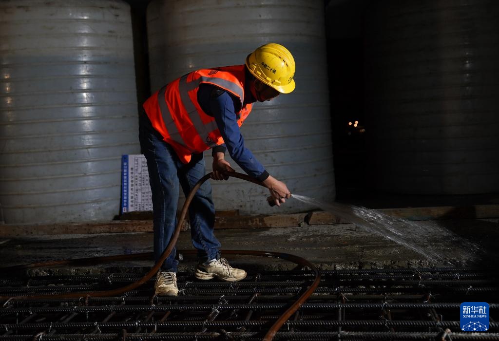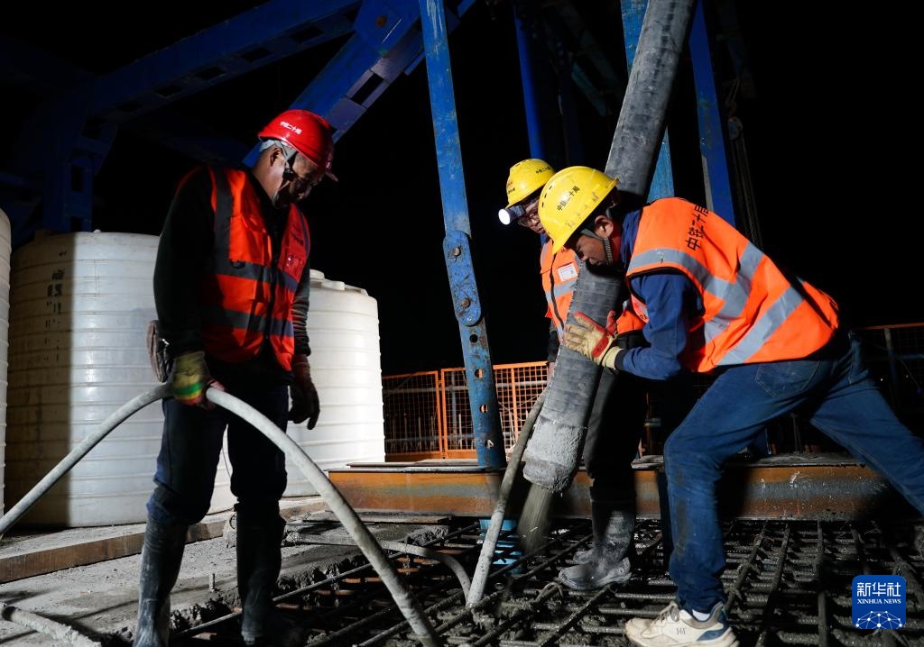 4月7日深夜,中铁建城通公司工人在合龙段进行浇筑前的准备工作。