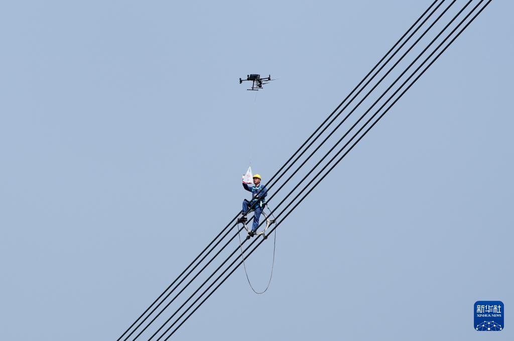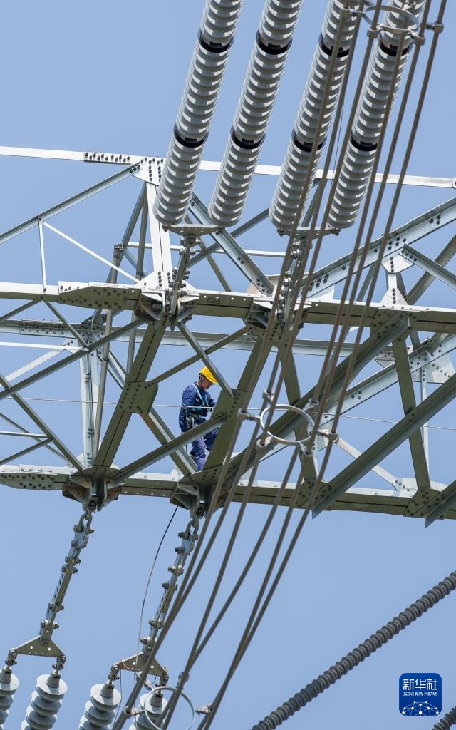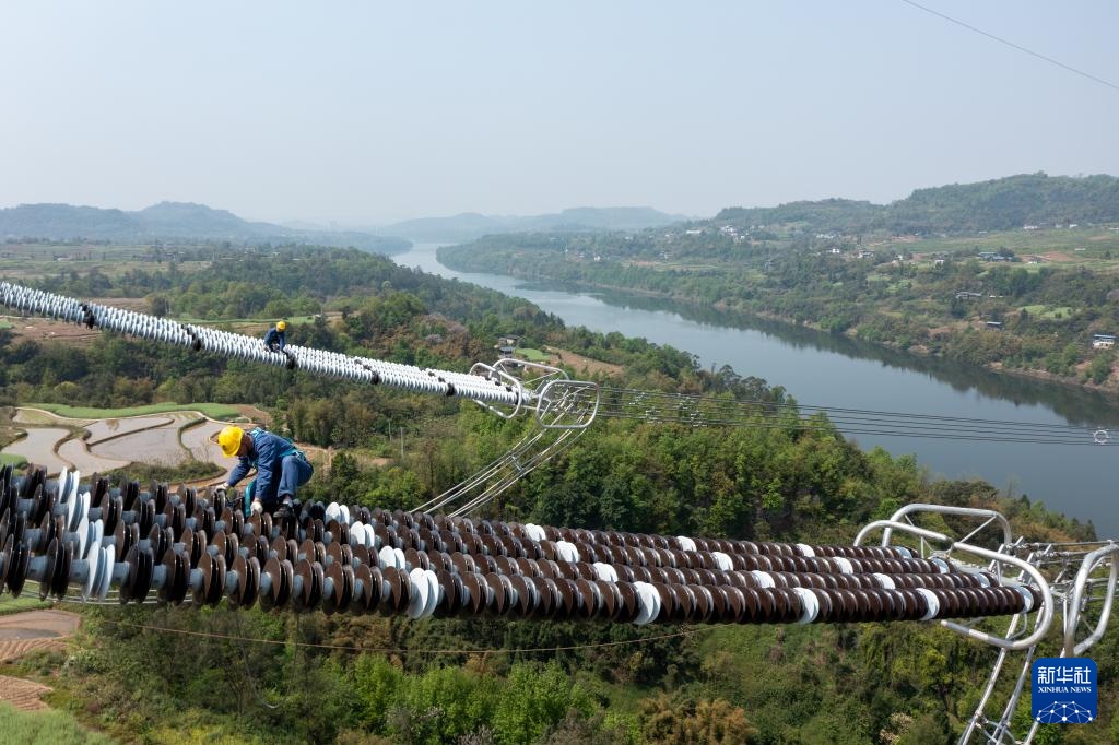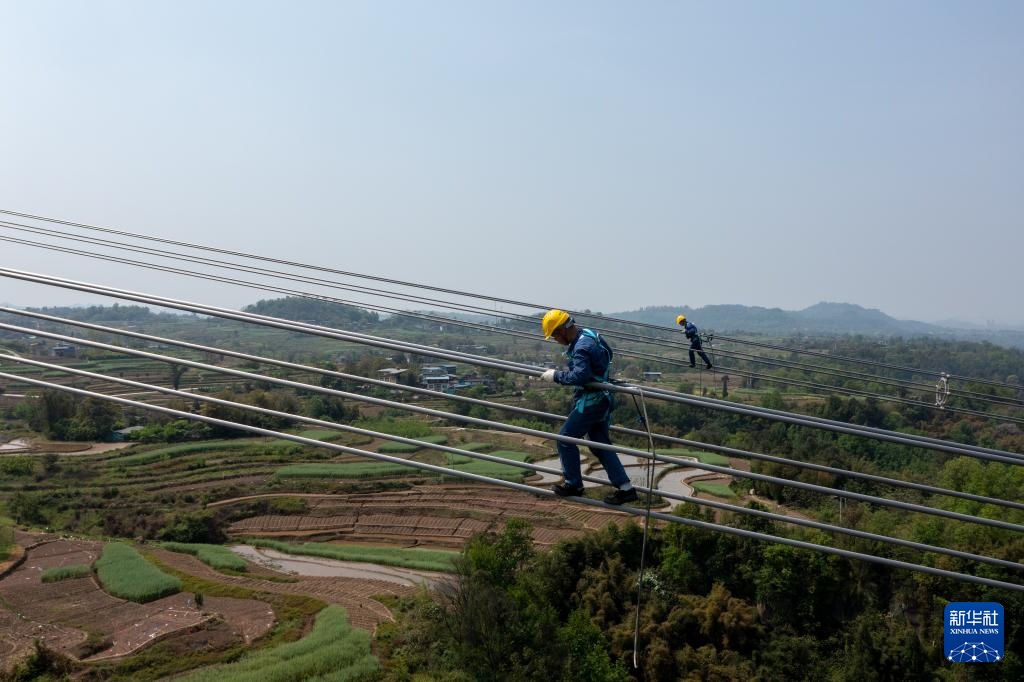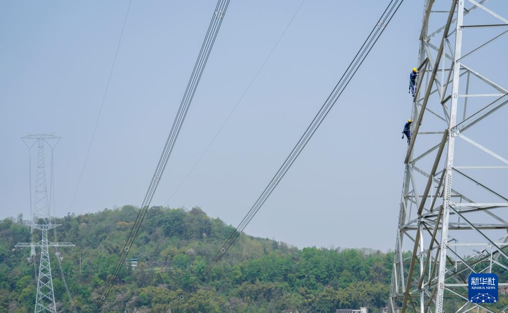 4月8日,在重庆市合川区,国网重庆超高压公司工作人员登塔对“疆电入渝”特高压工程重庆段开展走线验收。