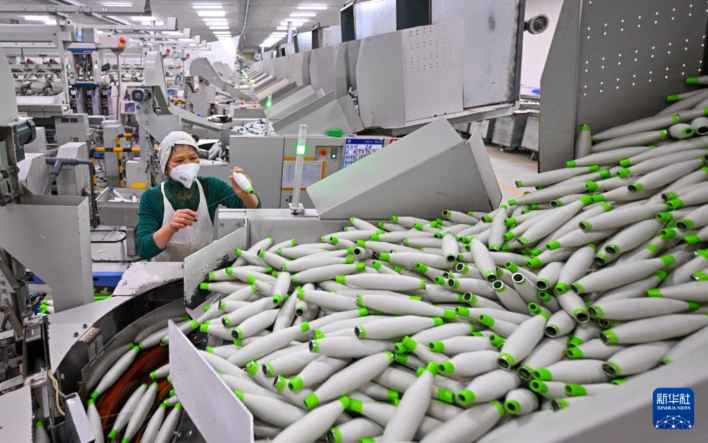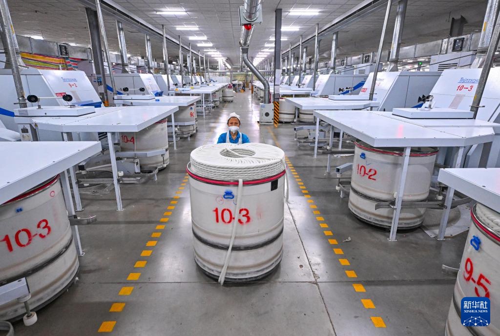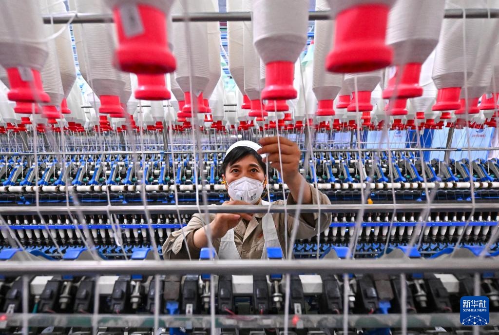 4月7日,在四川省眉山市仁寿县金鹅纺织有限公司生产车间,工人在生产线上工作。