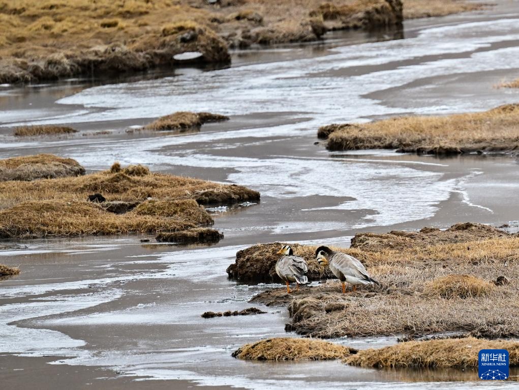 4月8日,两只斑头雁在青海隆宝国家级自然保护区内活动。