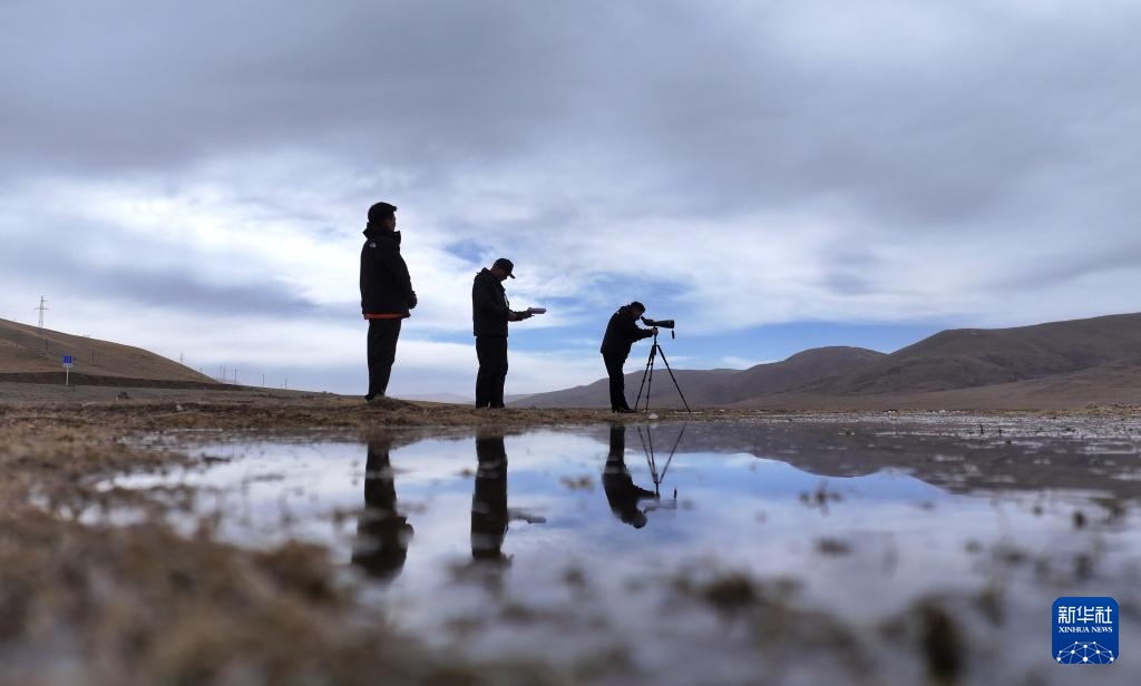 4月8日,青海隆宝国家级自然保护区生态管护员才仁多杰(右一)和同伴一起观测候鸟(无人机照片)。