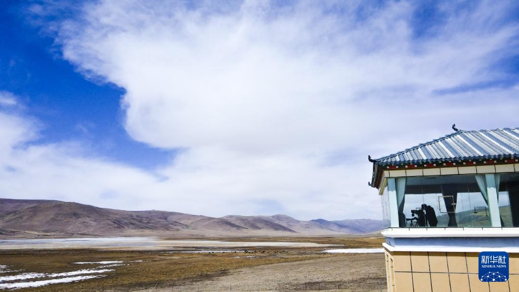 4月8日,生态管护员在青海隆宝国家级自然保护区管理站观测鸟类(无人机照片)。