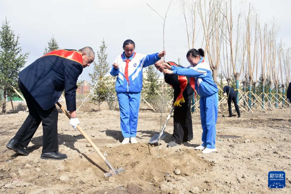 4月9日,在哈密市凤凰台大营,“哈密好人”代表、少先队员代表和西部计划大学生志愿者代表在种植“左公柳”。