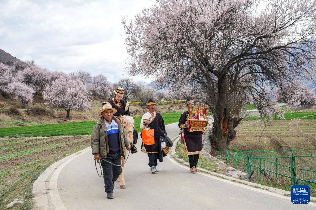 4月3日,林芝市朵当村群众身着盛装、手捧切玛为游客提供民俗体验活动。