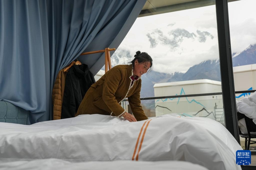 4月4日,林芝索松村一家民宿的服务员在整理房间。