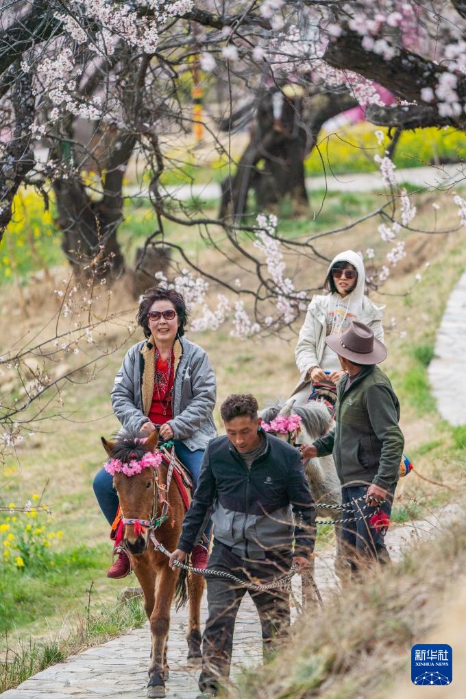 4月2日,游客在林芝市嘎拉村体验马背观花。