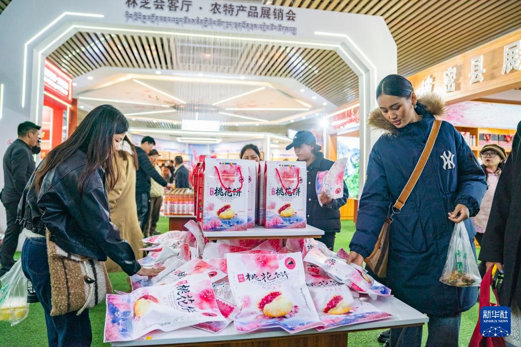 4月3日,游客在林芝市工布公园选购桃花饼。