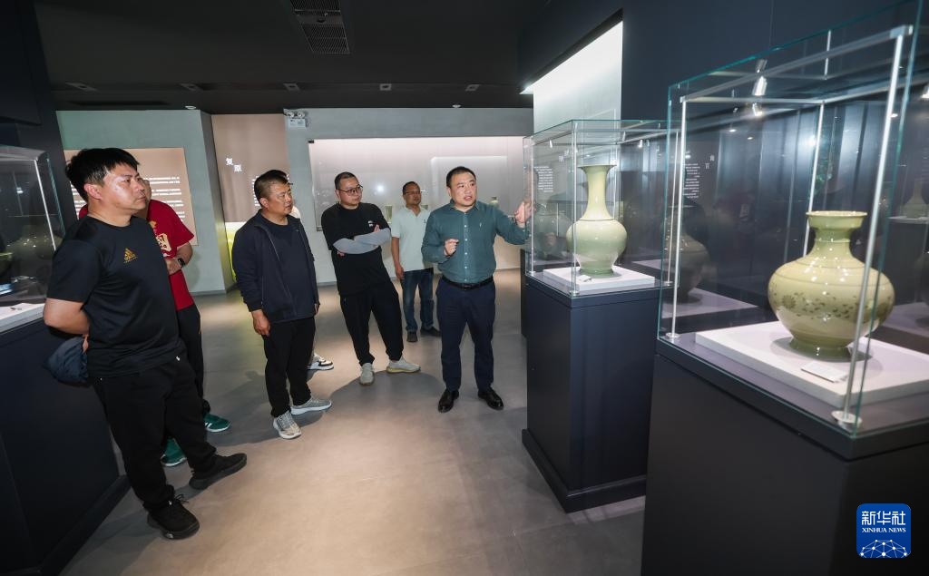 4月9日,在施山社区施家山公共文化空间的越窑青瓷施珍艺术馆内,文化特派员应周挺(右一)在给参观者介绍青瓷作品。