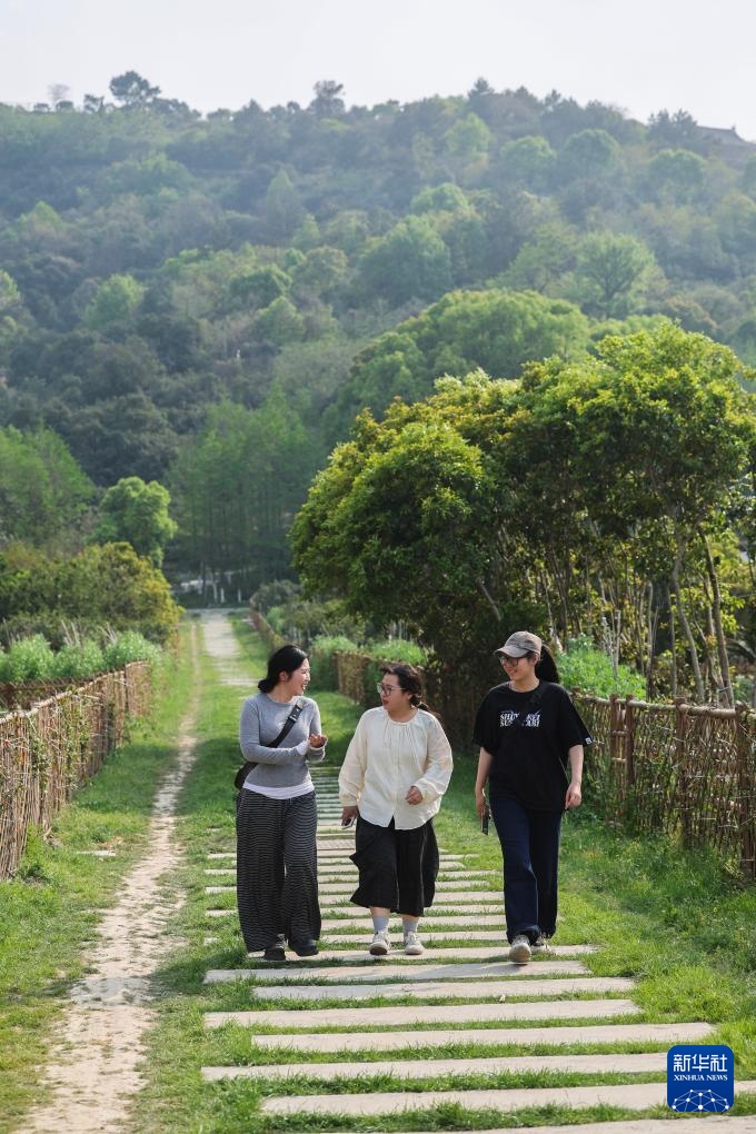 4月9日,游客在施山社区施家山公共文化空间的口袋公园内散步。这个口袋公园依托菜园旁的闲置地块改造而成。