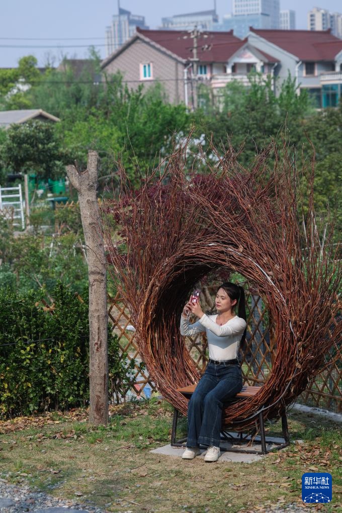 4月9日,游客在施山社区施家山公共文化空间的口袋公园内拍照留影。这个口袋公园依托菜园旁的闲置地块改造而成。