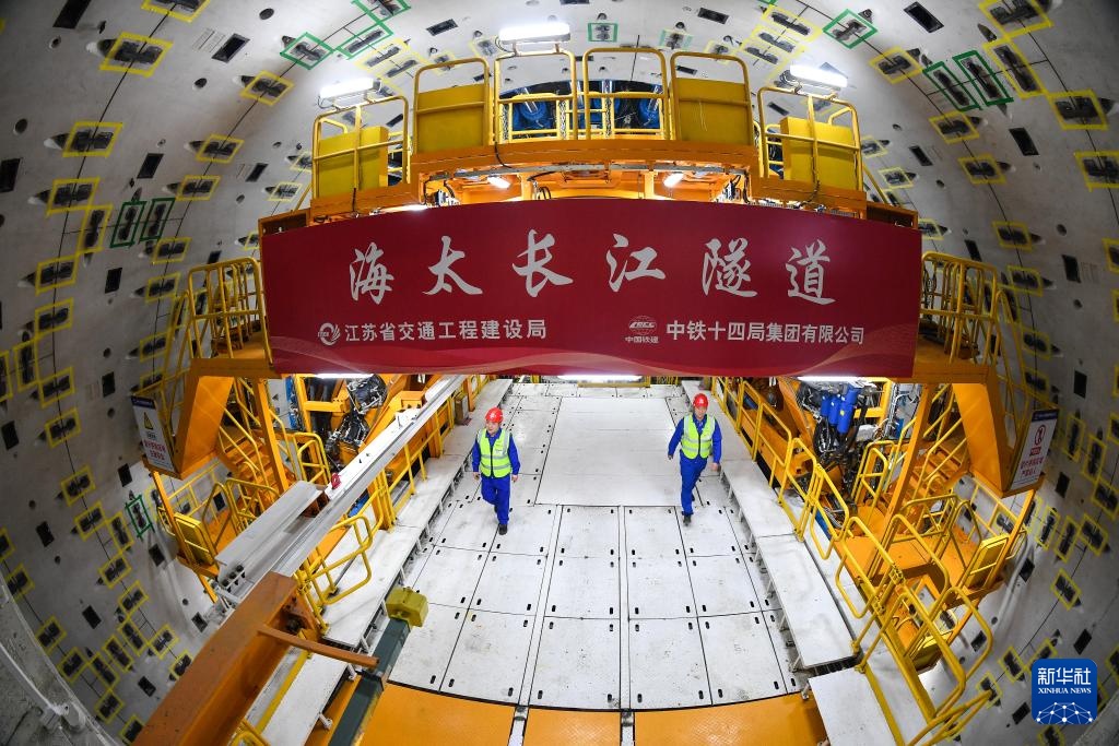 4月9日,中铁十四局工作人员在“江海号”盾构机内进行管片拼装作业。
