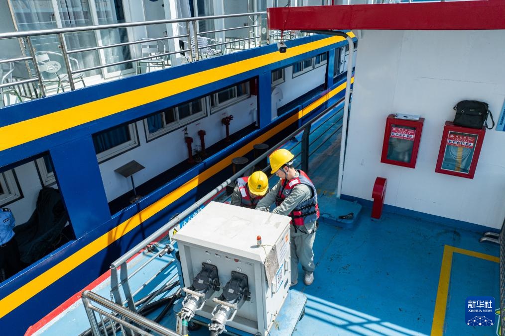 4月10日,国网宜昌供电公司岸电运维人员在湖北秭归港为邮轮接用岸电。