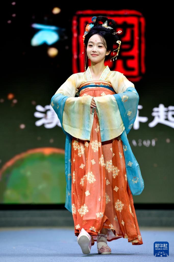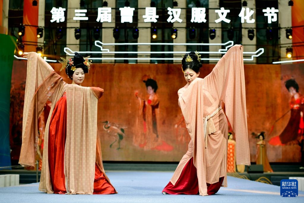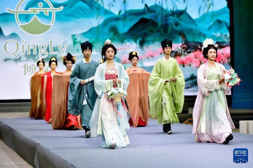 在曹县e裳小镇数字经济产业园,模特在曹县汉服2025春夏新品发布会上走秀(4月10日摄)。