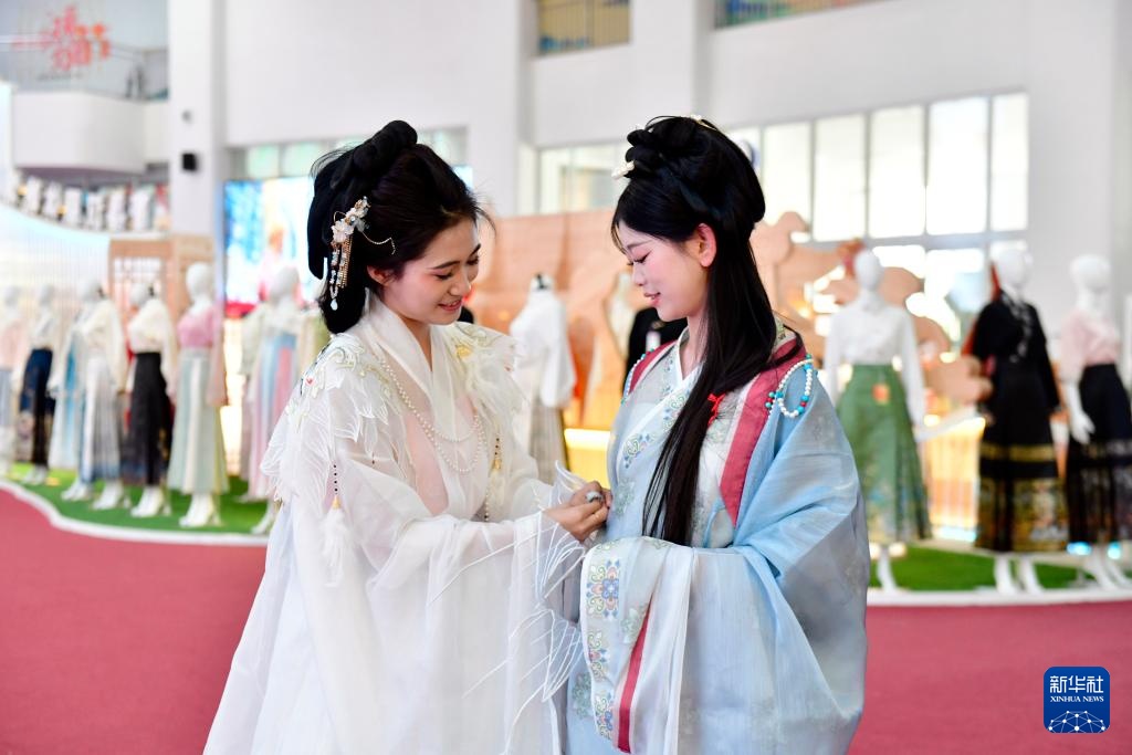 两名女孩在曹县e裳小镇数字经济产业园汉服体验馆试穿汉服(4月10日摄)。