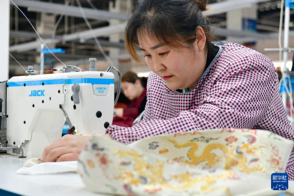 工作人员在曹县有爱云仓汉服基地加工汉服(4月10日摄)。