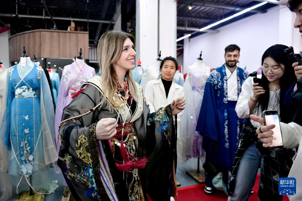 参加曹县汉服文化节的意大利嘉宾卡米拉在曹县有爱云仓汉服基地试穿汉服(4月8日摄)。