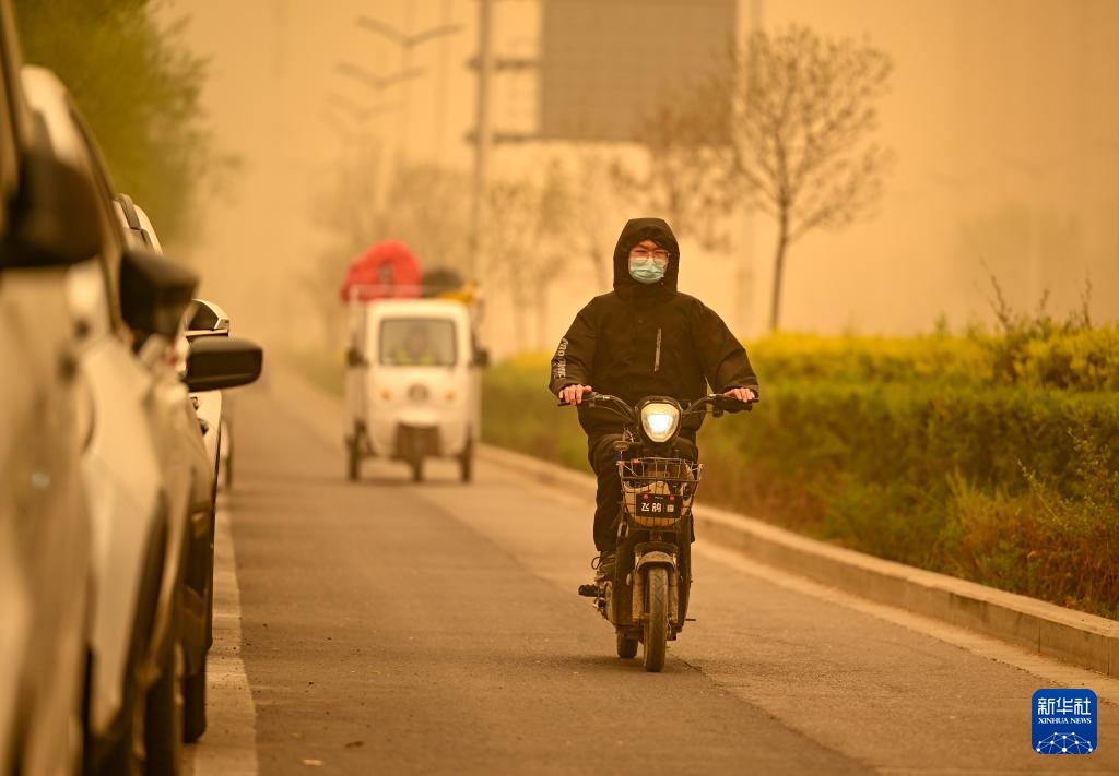 4月11日,银川市民在强沙尘暴天气中骑车出行。