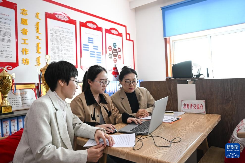 4月11日,在内蒙古兴安盟科右中旗巴彦呼舒镇新时代文明实践所,乡镇干部在制作“村闻联播”。