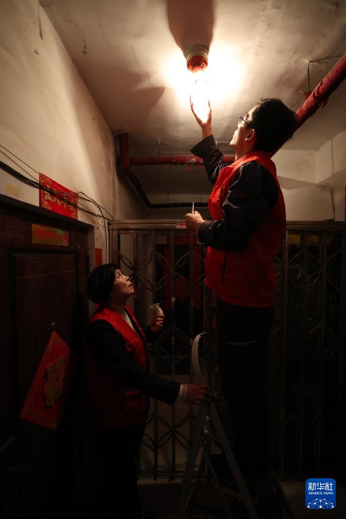 4月11日,在福康社区一楼道内,马凤侠(左)和志愿者在换灯泡。