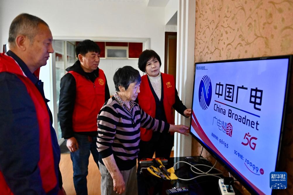 4月11日,马凤侠(右一)和志愿者一起帮社区内的孤寡老人安装电视。