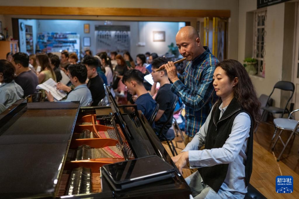 3月24日,在越南首都河内,童光荣和莫双双参加“河内之声”国际合唱团排练。
