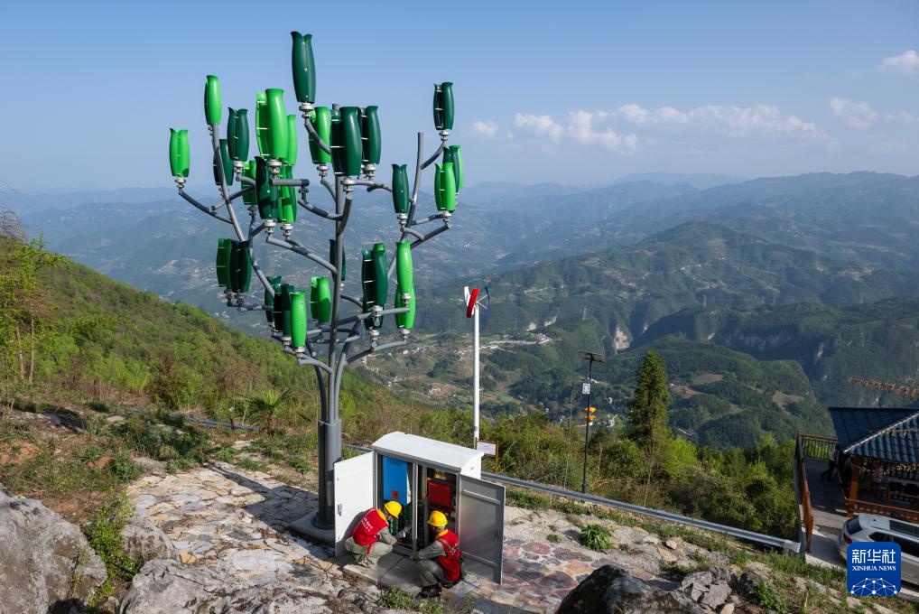 4月10日,国网巴东县供电公司工作人员在土店子村检查微风发电设备。