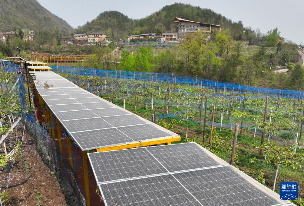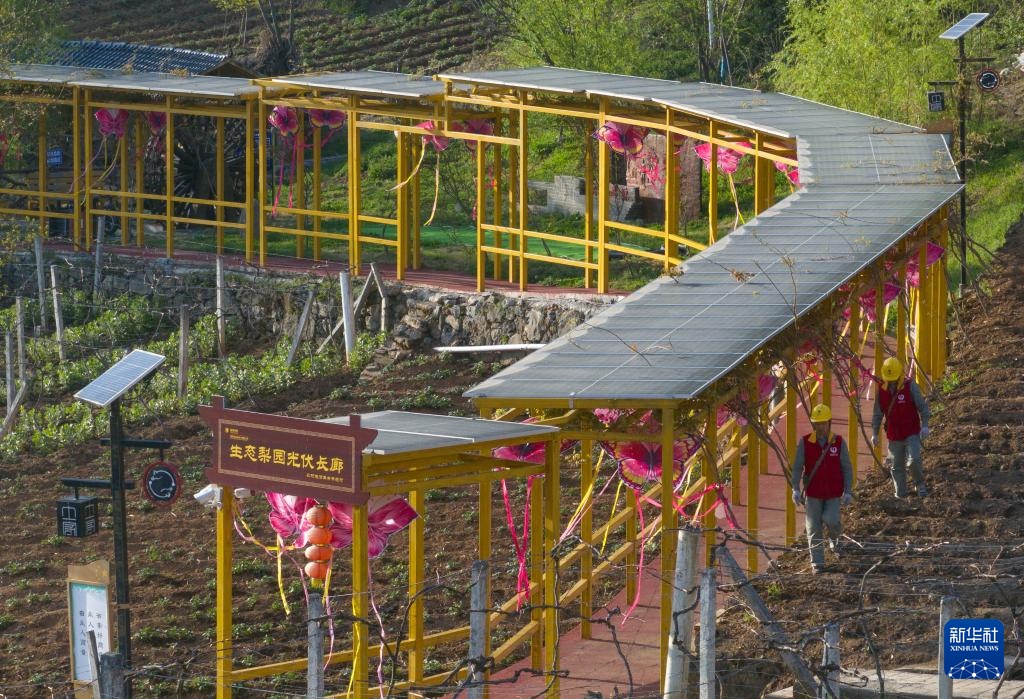4月10日,国网巴东县供电公司工作人员对土店子村梨树园中的光伏长廊进行巡视(无人机照片)。