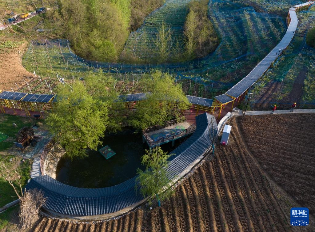 这是4月12日在土店子村拍摄的梨树园中的光伏长廊(无人机照片)。