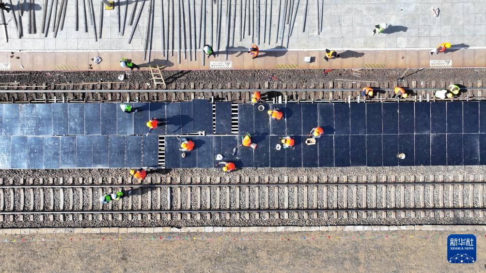 4月14日,佳同铁路扩能改造工程富锦站内施工人员在进行临时站台搭建施工作业(无人机照片)。