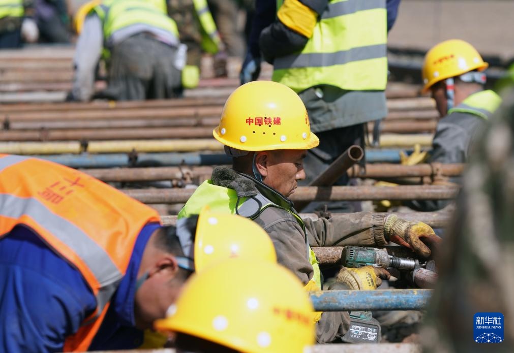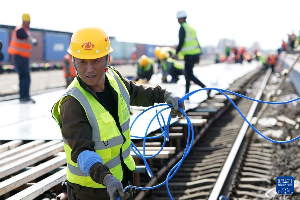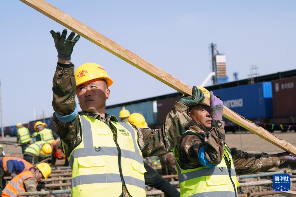 4月14日,工人在佳同铁路扩能改造工程富锦站改造现场施工。