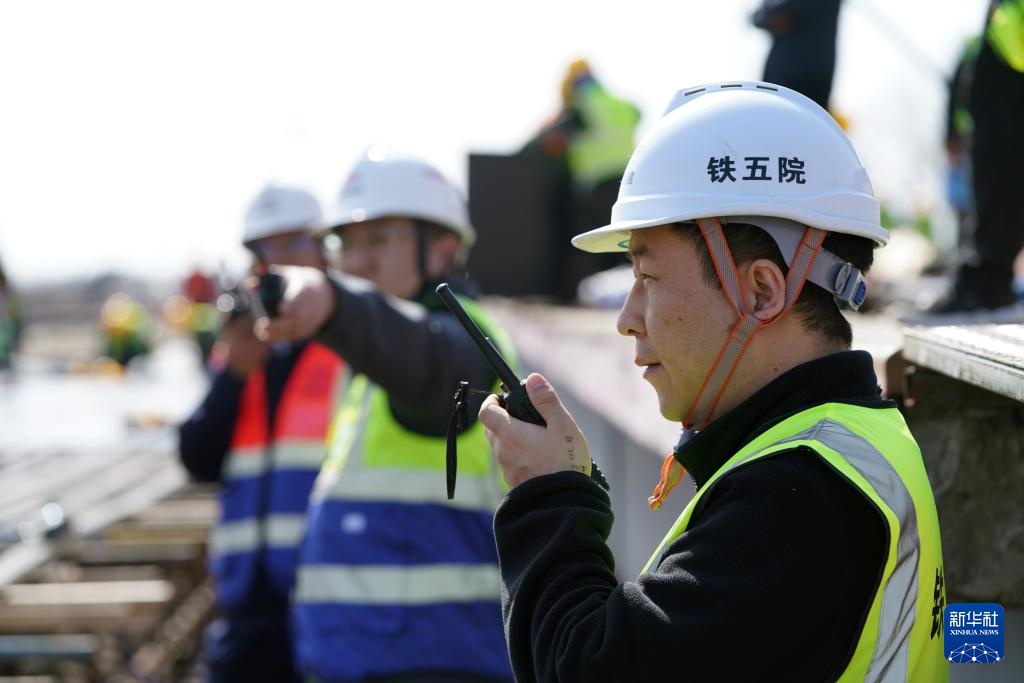 4月14日,工作人员在佳同铁路扩能改造工程富锦站改造现场勘察复核工程项目数据。