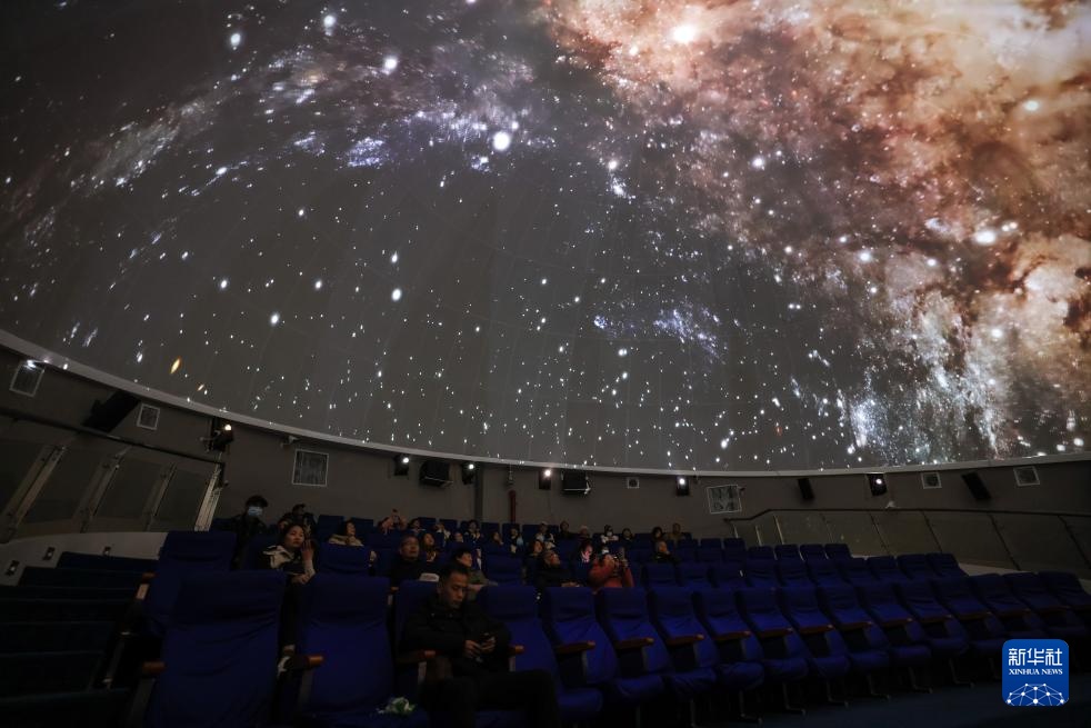 游客在平塘县“天文小镇”的天文体验馆内观看球幕电影(2月18日摄)。