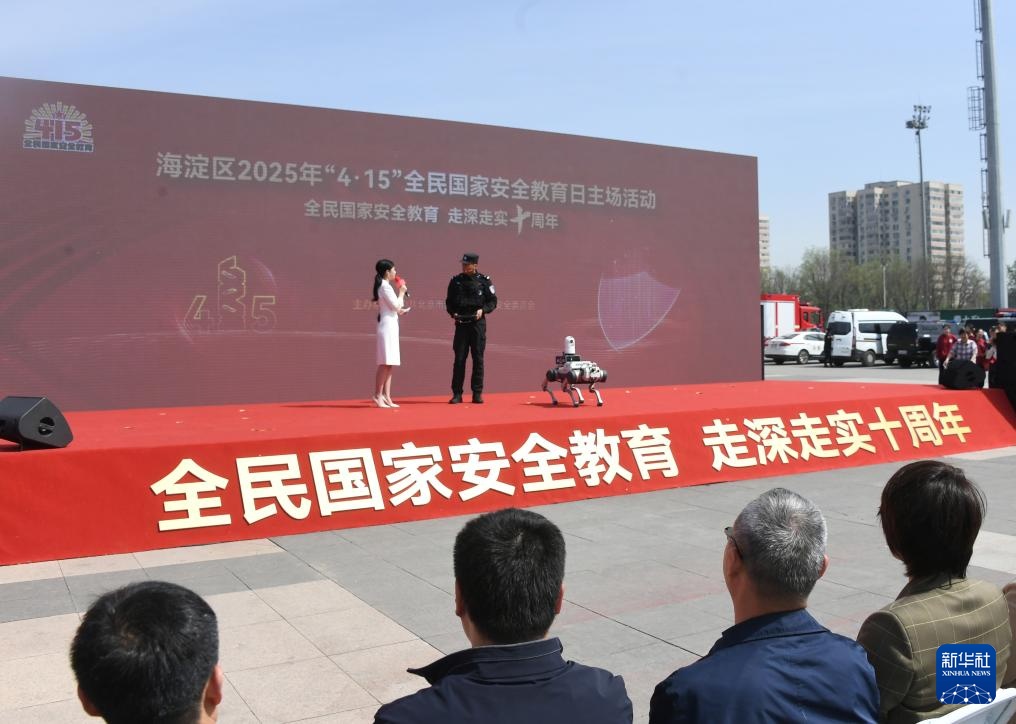 4月15日,在北京市海淀区2025年“4·15”全民国家安全教育日主场活动现场,海淀特警向市民介绍警用智能机器狗。