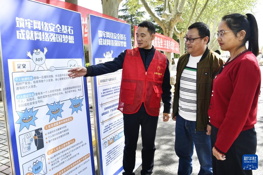 4月15日,山东省枣庄市山亭区青年志愿者在府前路向市民宣传网络安全知识。