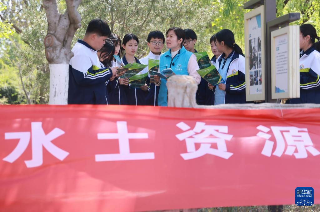 4月15日,在山东省临沂市中小学生综合实践基地,兰山区水务局志愿者在向学生普及国家水土资源安全常识。