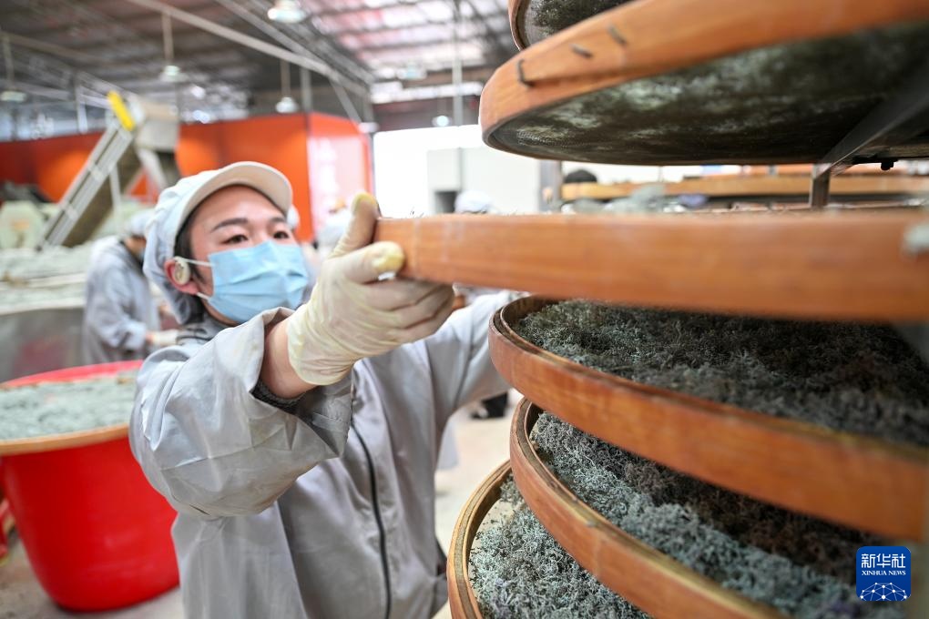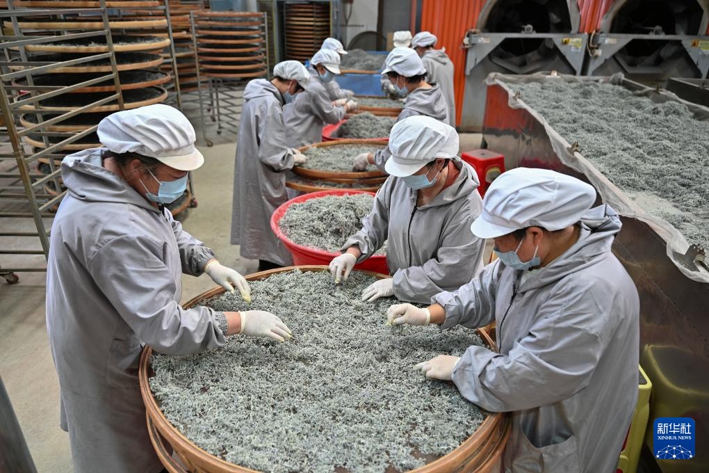 4月14日,在湖北省来凤县翔凤镇一家藤茶公司生产车间,工人在筛选藤茶。
