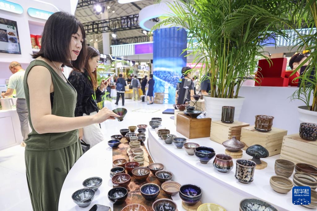 4月15日,观众在消博会上参观建盏产品。建窑建盏烧制技艺是国家级非物质文化遗产。