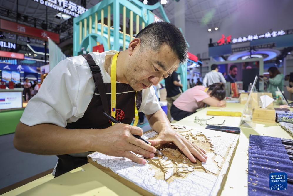 4月15日,东阳木雕传承人在消博会现场雕刻木雕。东阳木雕是国家级非物质文化遗产。