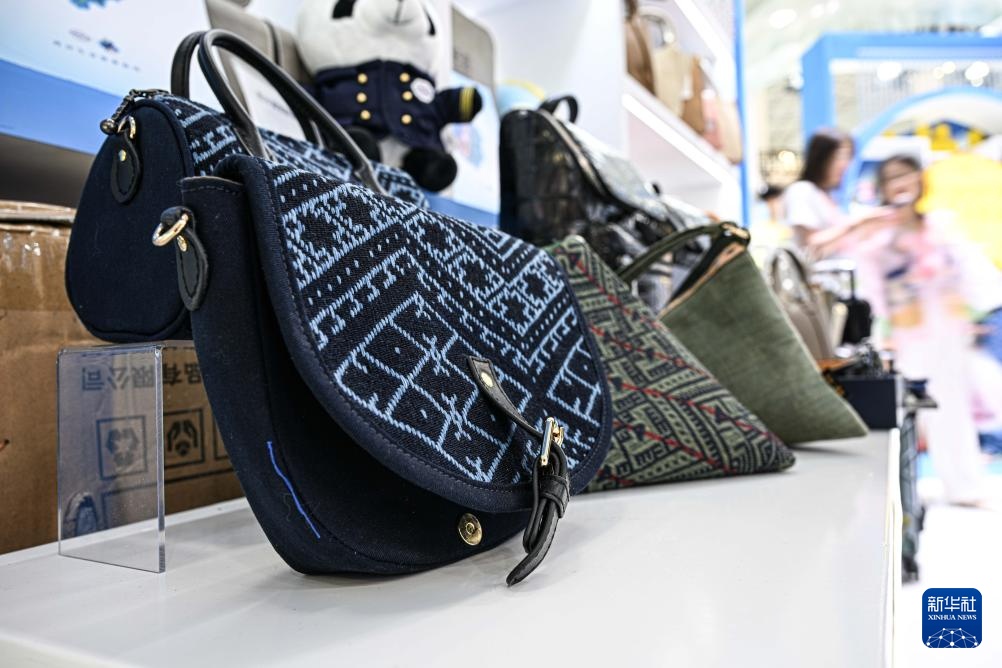 4月15日在第五届消博会海南馆拍摄的带有黎锦元素的手包。黎族传统纺染织绣技艺被列入人类非物质文化遗产代表作名录。