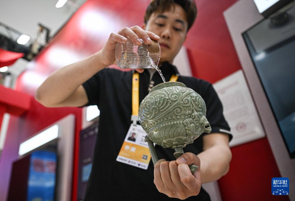 4月15日,工作人员在第五届消博会陕西馆展示耀州窑倒装壶。耀州窑陶瓷烧制技艺是国家级非物质文化遗产。