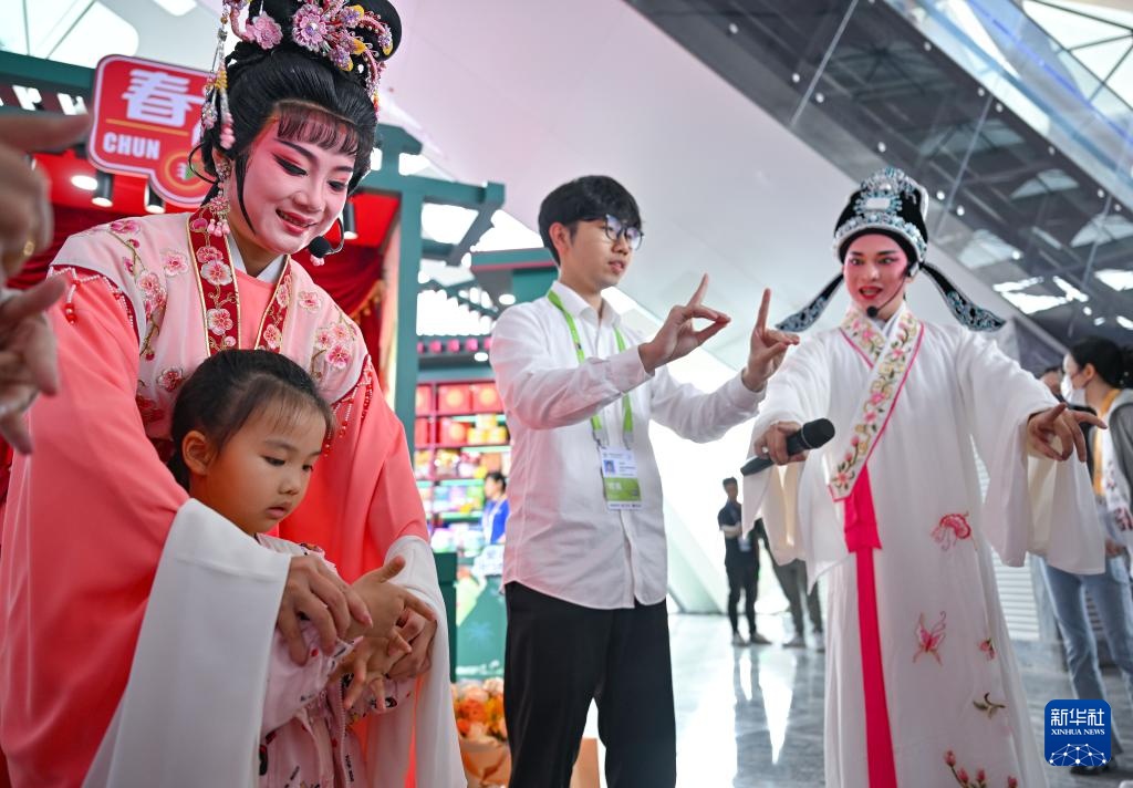 4月13日,琼剧演员在消博会上与观众互动。琼剧是国家级非物质文化遗产。