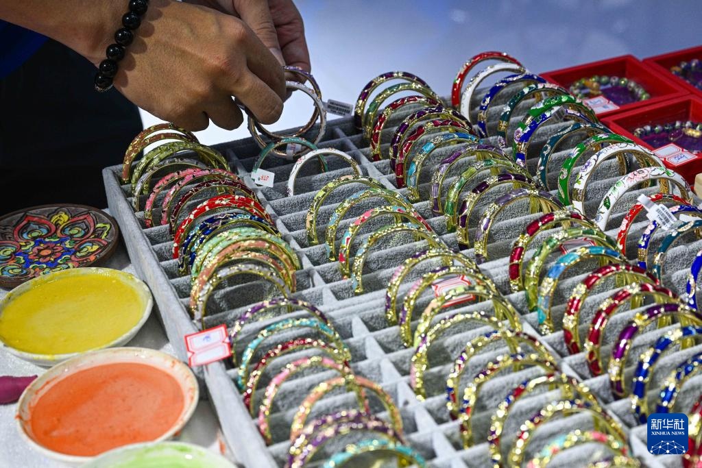 4月15日,观众在第五届消博会北京馆选购景泰蓝手镯。景泰蓝制作技艺是国家级非物质文化遗产。