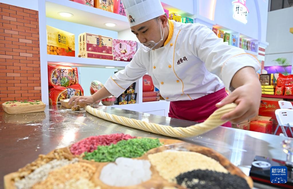 4月14日,厨师在消博会天津馆制作桂发祥十八街麻花。桂发祥十八街麻花制作技艺是国家级非物质文化遗产。