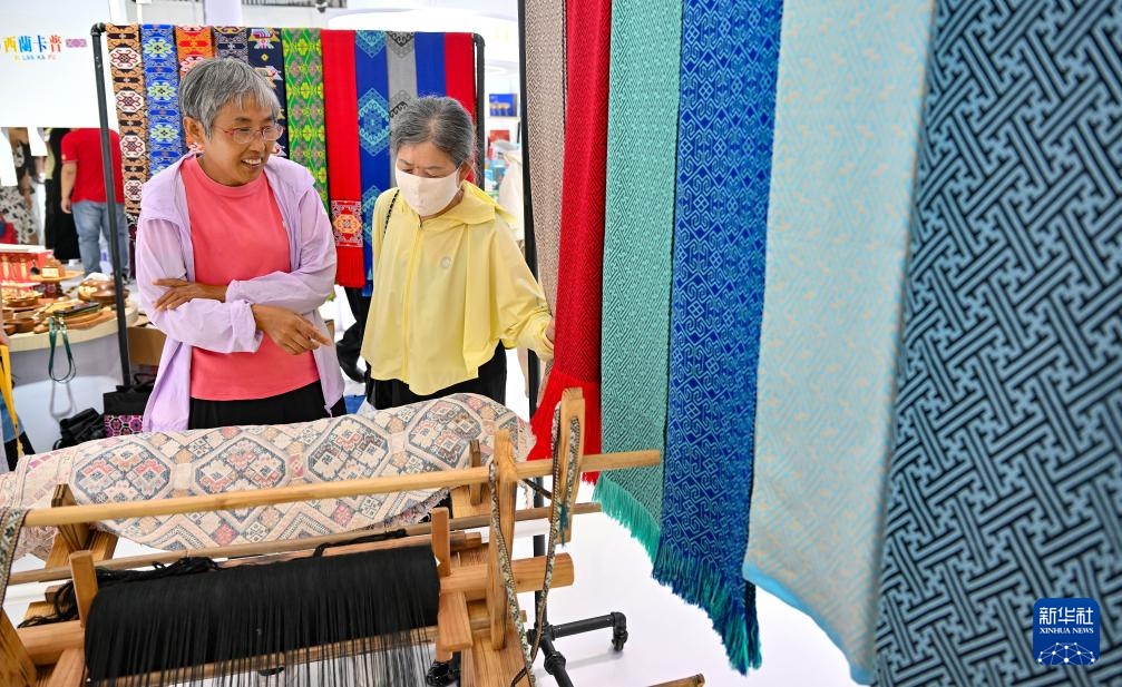 4月15日,观众在消博会湖北馆选购西兰卡普围巾。西兰卡普编织技艺是国家级非物质文化遗产。