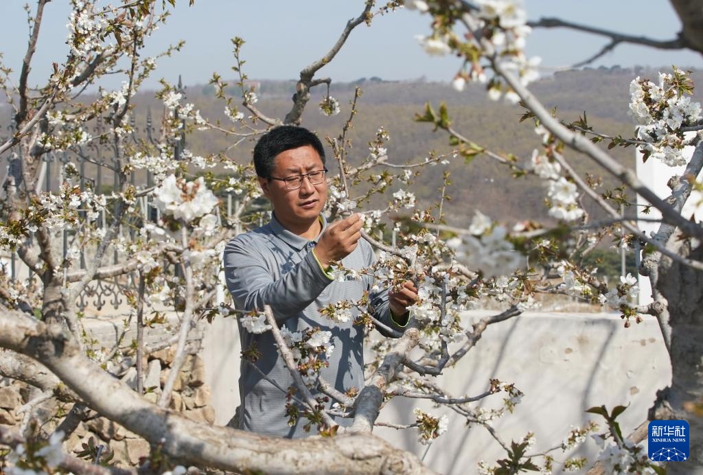 4月16日,秦皇岛市山海关区石河镇一家樱桃种植合作社的社员在果园疏花。